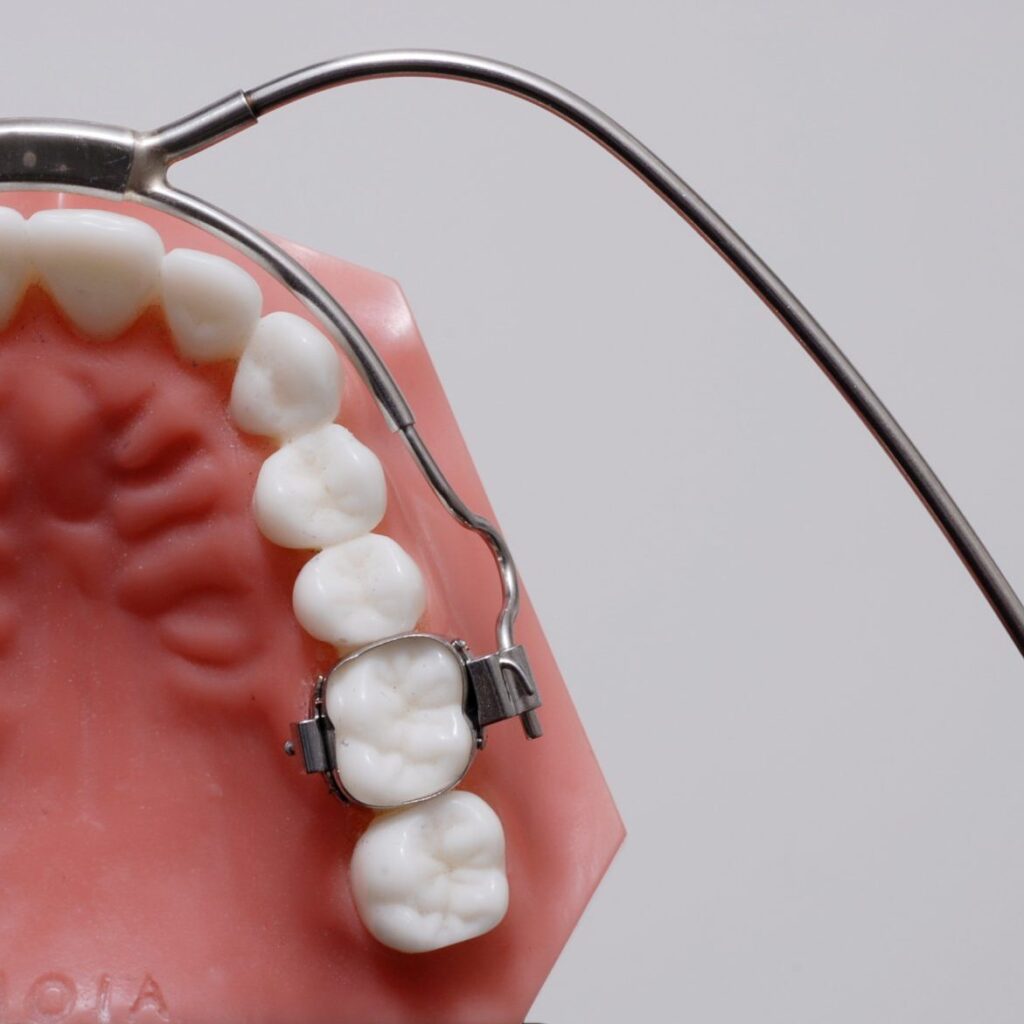 Indien er onvoldoende ruimte is om alle tanden te laten doorbreken, kunnen de kiezen naar achter verplaatst worden met behulp van een headgear. Deze beugel wordt 14u per dag gedragen, gedurende ongeveer 4 maand. Als deze beugel goed gedragen wordt kunnen extracties vermeden worden.
